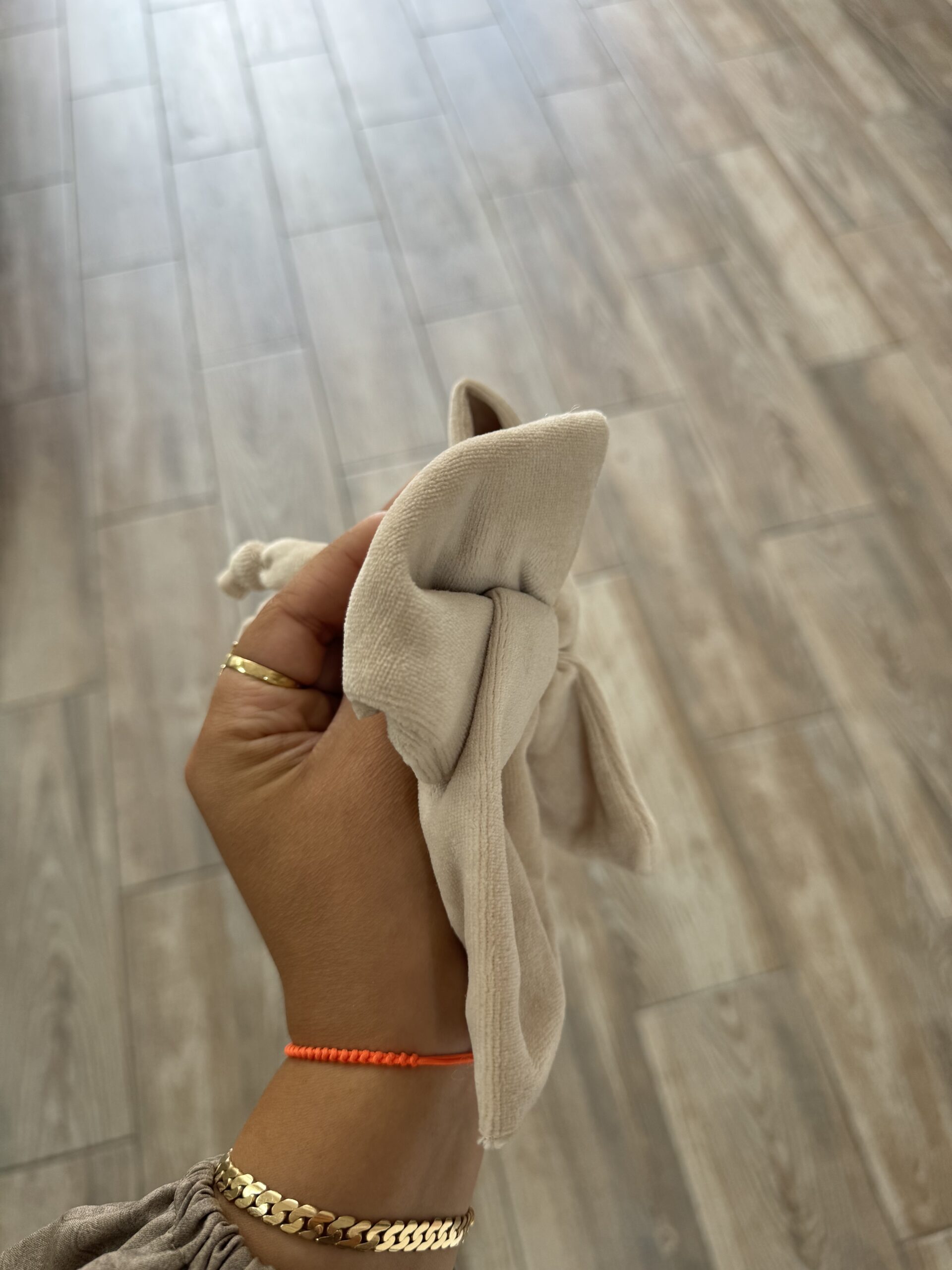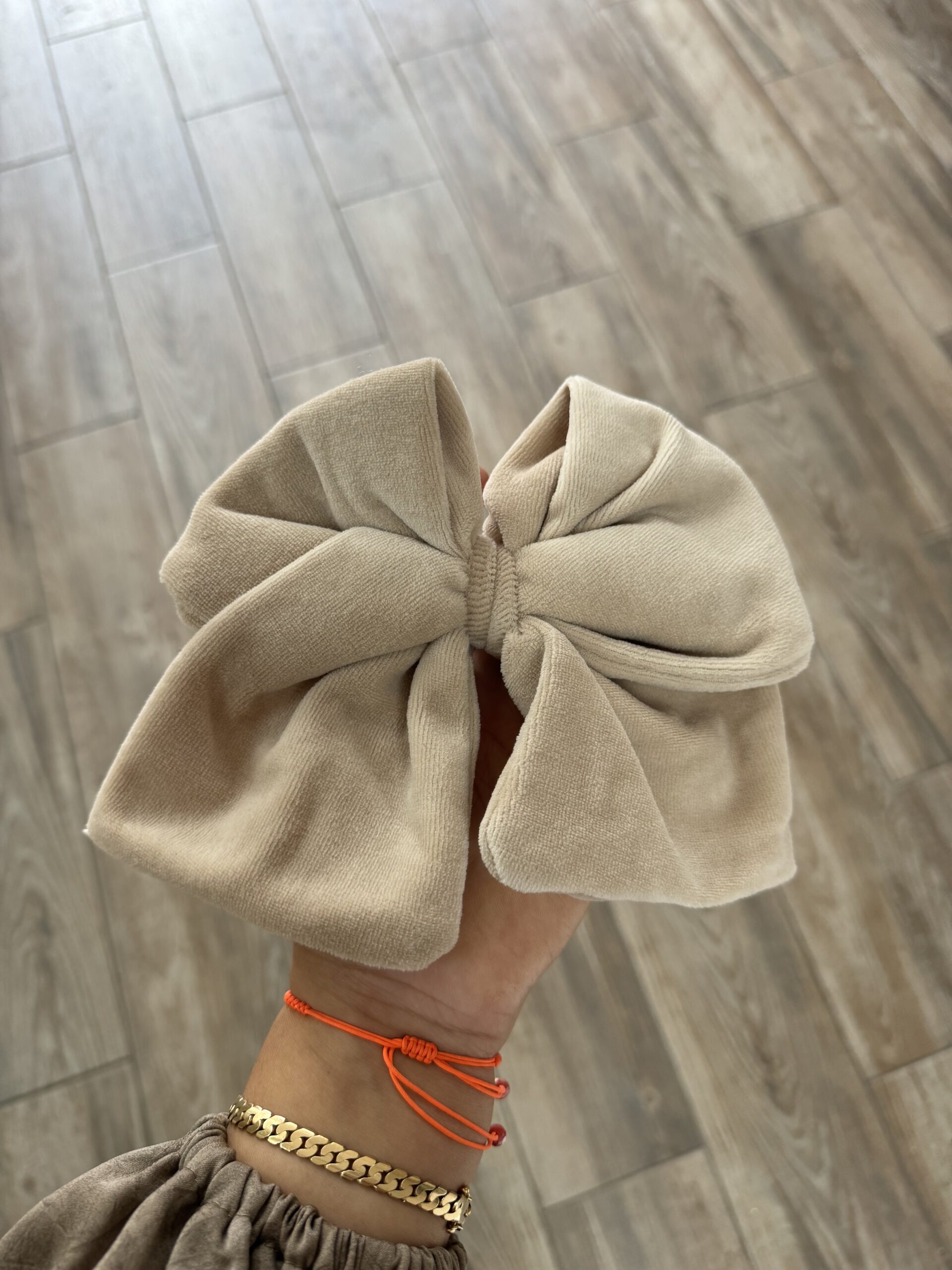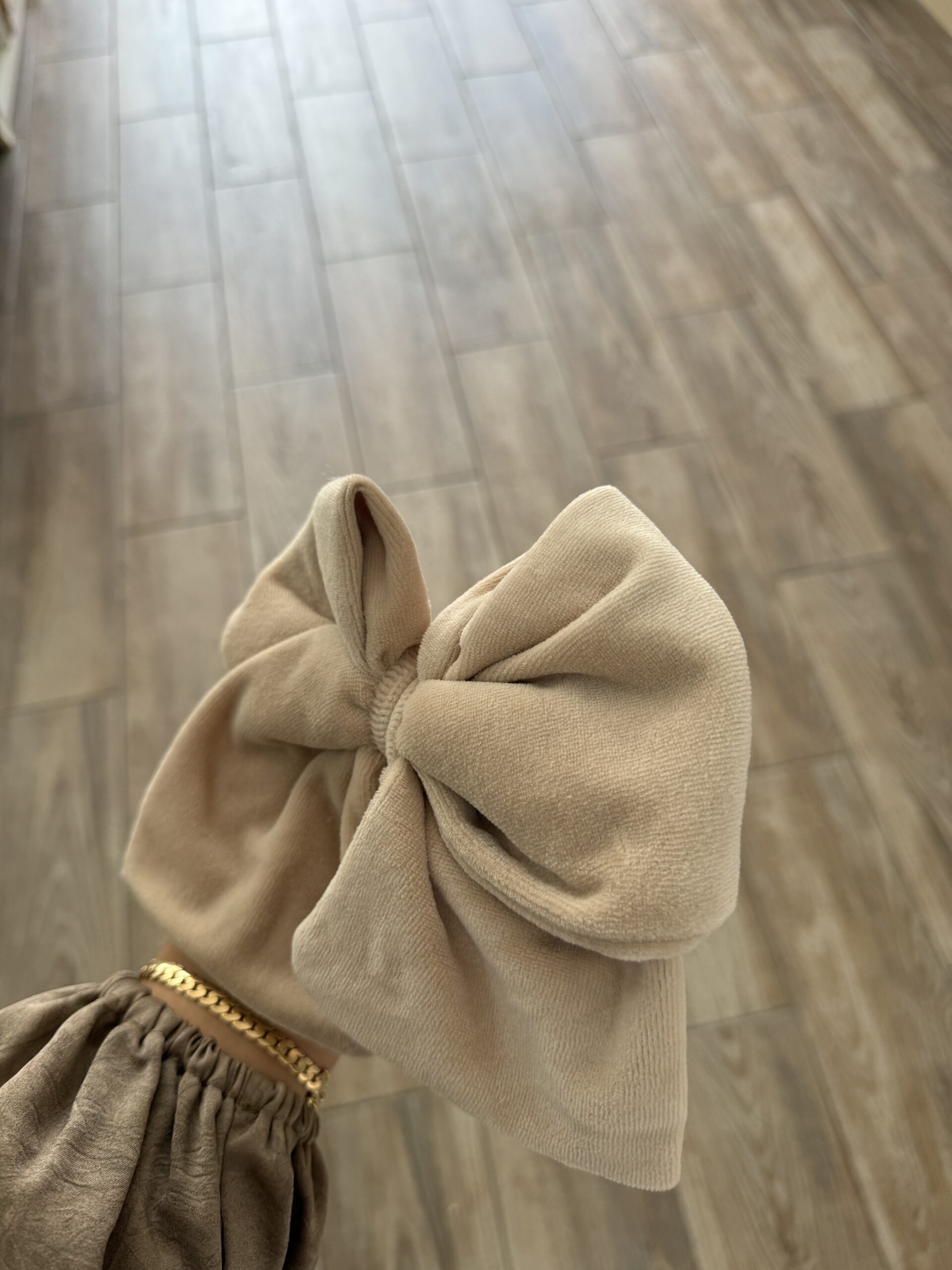 De Velvety Beige strik die standaard geleverd wordt bij Baby Luxury’s Velvety Vlecht babynestjes én Velvety XXL speelnesten.