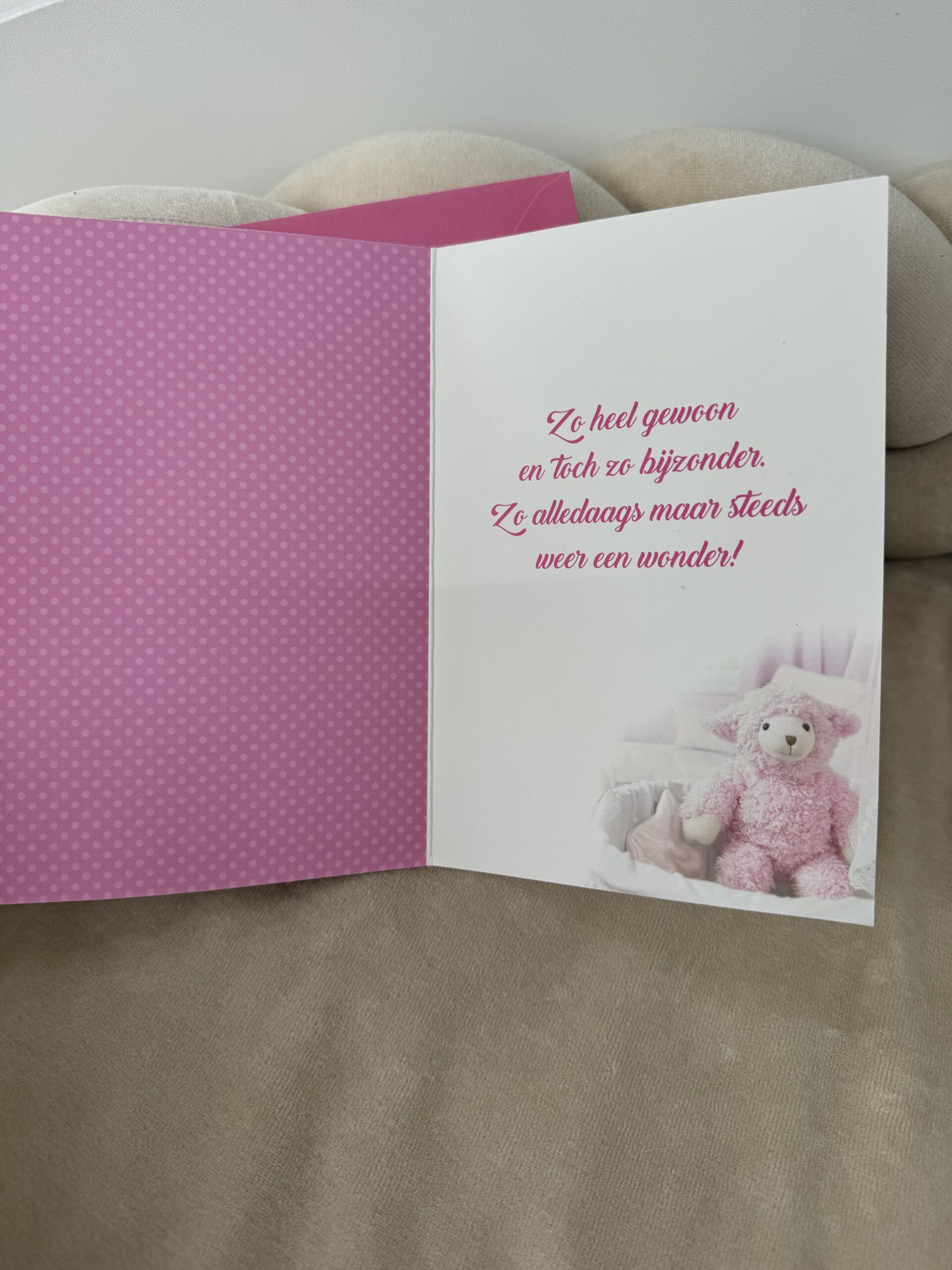 Inclusief een roze enveloppe.